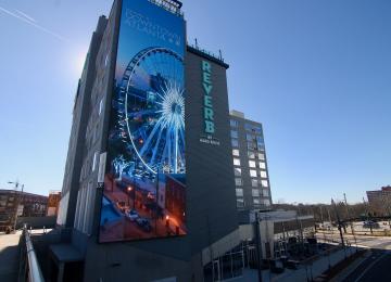 You can't miss Reverb's towering LED board facing Mercedes-Benz Stadium