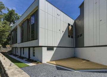 Four stories with rooftop decks overlooking Memorial Drive, a cemetery
