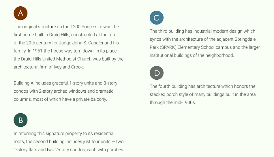 The sold-out first 1200 Ponce facet was the Choate + Hertlein Architects-designed conversion of the former Greek Revival-stye sanctuary and adjoining preschool. It included 23 condos, including some multistory units meant to live like townhomes where the pews had once stood. Prices ranged from the $600,000s to north of $1.6 million.