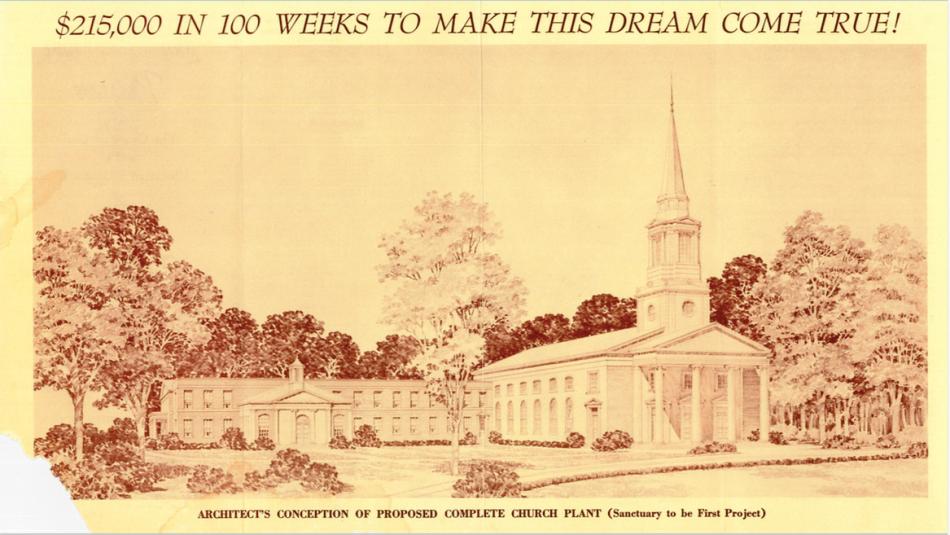 This 1951 fundraising brochure shows plans for the sanctuary and, at left, the two-story school addition.Courtesy of Minerva