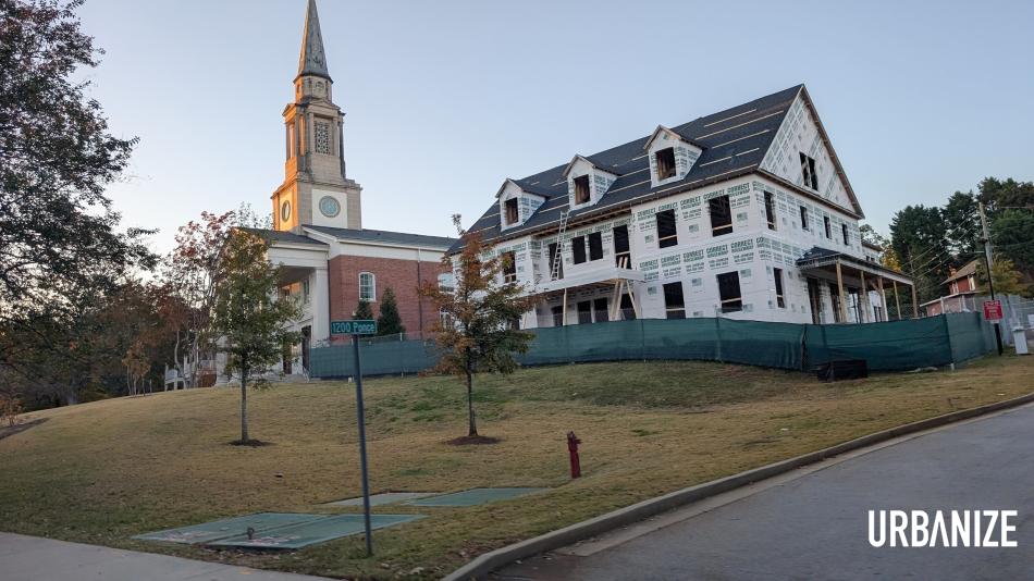As seen this week, the next phase of 1200 Ponce residential development in relation to the former 1950s church property. Josh Green/Urbanize Atlanta