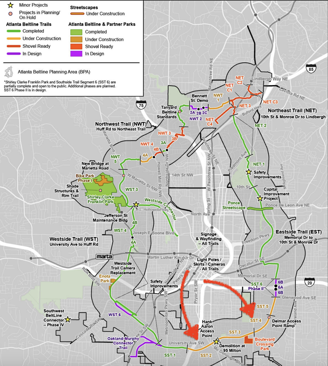 Full scope of Beltline trail and park construction progress, as of December. Red arrows indicate Southside Trail sections planned to be opened in the first half of 2026. Courtesy of Atlanta Beltline Inc.