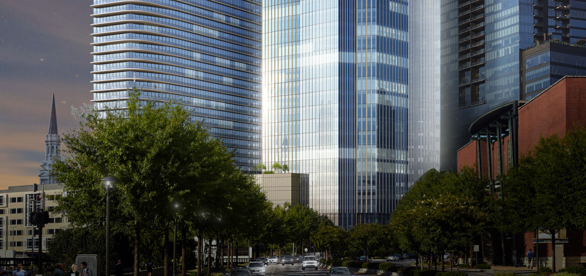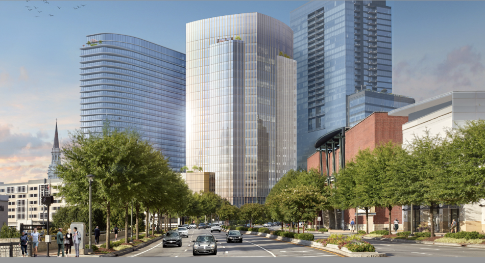 3600 Peachtree plans call for the 375,000-square-foot office tower to stand 21 stories, with a 300-unit apartment tower next door branded as a Novel building, which is Crescent Communities’ urban product. (Recent filings indicate the apartments will rise 32 floors.) Plans also call for food and beverage spaces at street level.