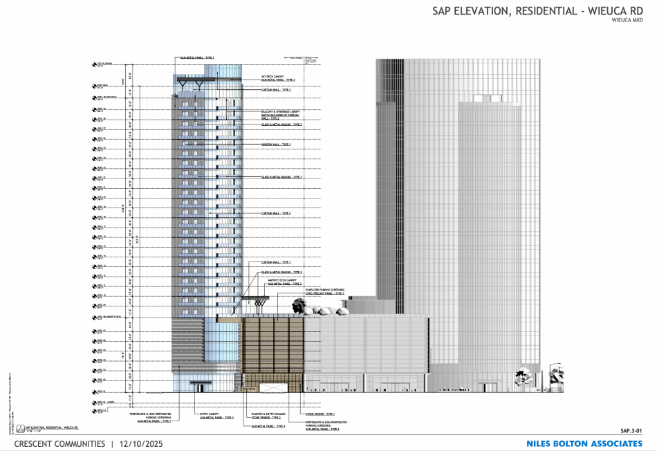The 435,000-square-foot apartment tower, meanwhile, would stand 32 stories (334 feet), topped with a “sky deck,” according to Crescent Communities’ filings.