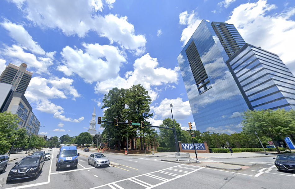 The corner church property in question today (right) where Peachtree and Wieuca roads meet in Buckhead. Google Maps
