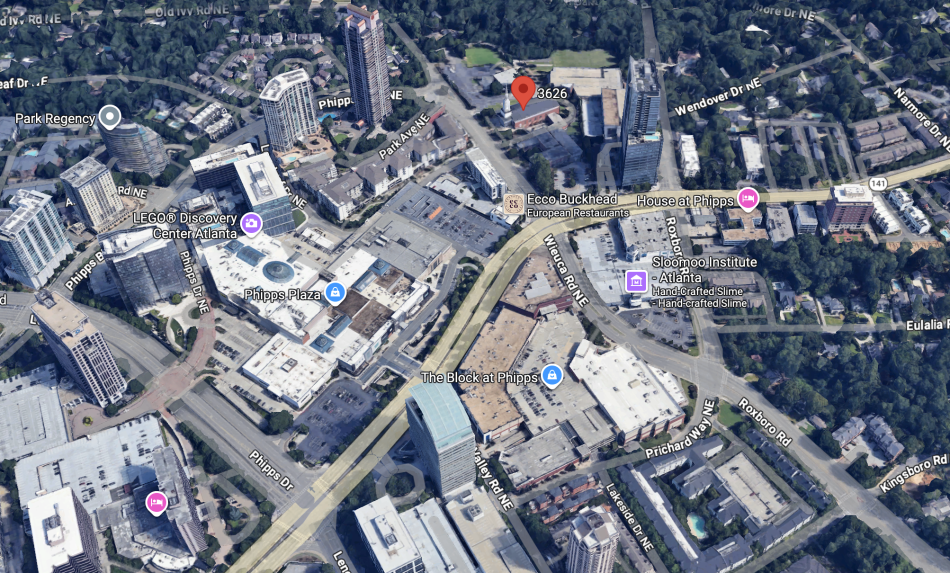 Location of the 3626 Peachtree Road NE property in relation to Phipps Plaza and other landmarks. Google Maps