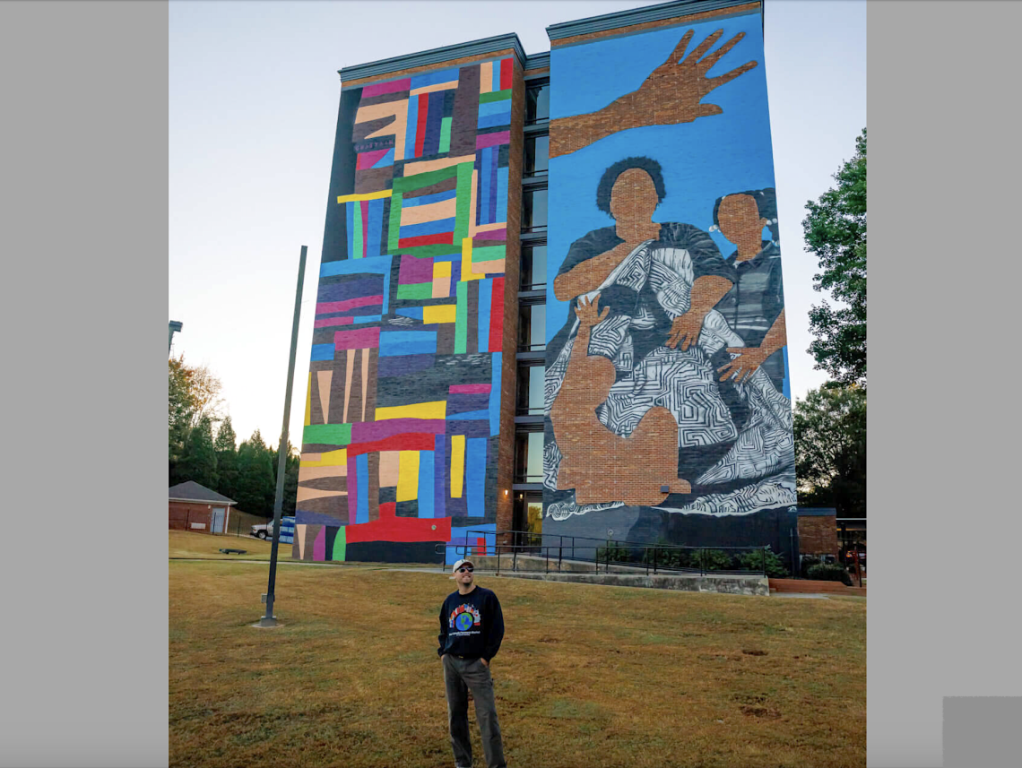 Atlanta artist Chaz Clark and the recently completed mural in East Lake. Courtesy of Columbia Residential