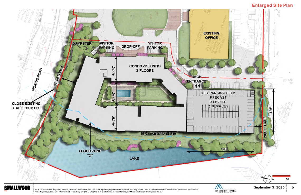 Site-plan breakdown for the westernmost portion of the site, next to an existing mid-rise office building. McKinley Homes; designs, Smallwood, Reynolds, Stewart, Stewart & Associates