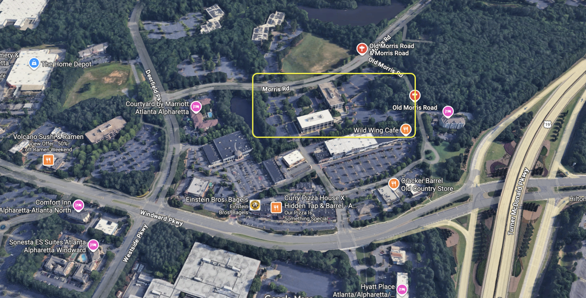 Home to two office buildings totaling 212,000 square feet, the site near Windward Parkway along Morris Road is situated near Alpharetta’s border with the City of Milton.