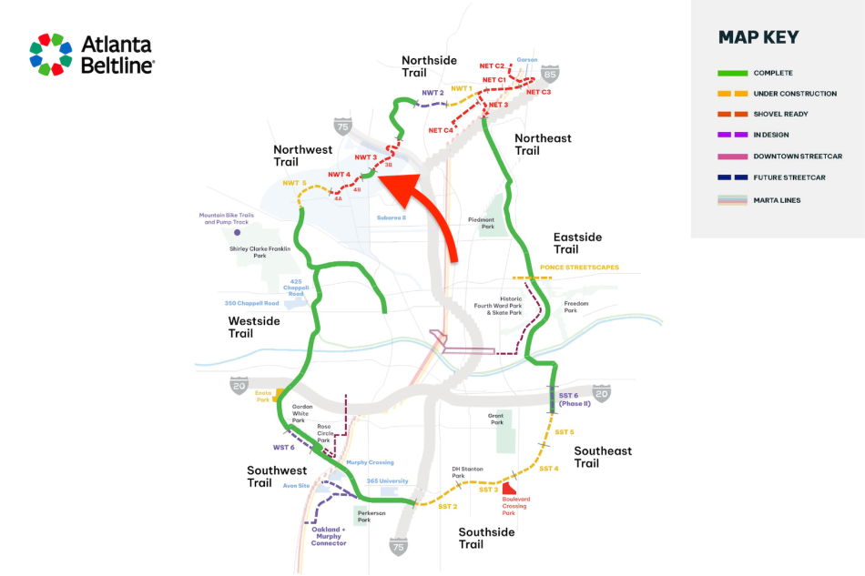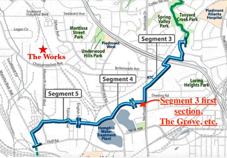 The adjacent Beltline Segment 3 section in question will eventually span 1.2 miles, starting near Monday Night Brewing and crossing under Interstate 75 at Tanyard Creek. Beltline leadership says that section is fully designed, in final permitting stages, and scheduled to be bid out for construction in roughly the next six months.