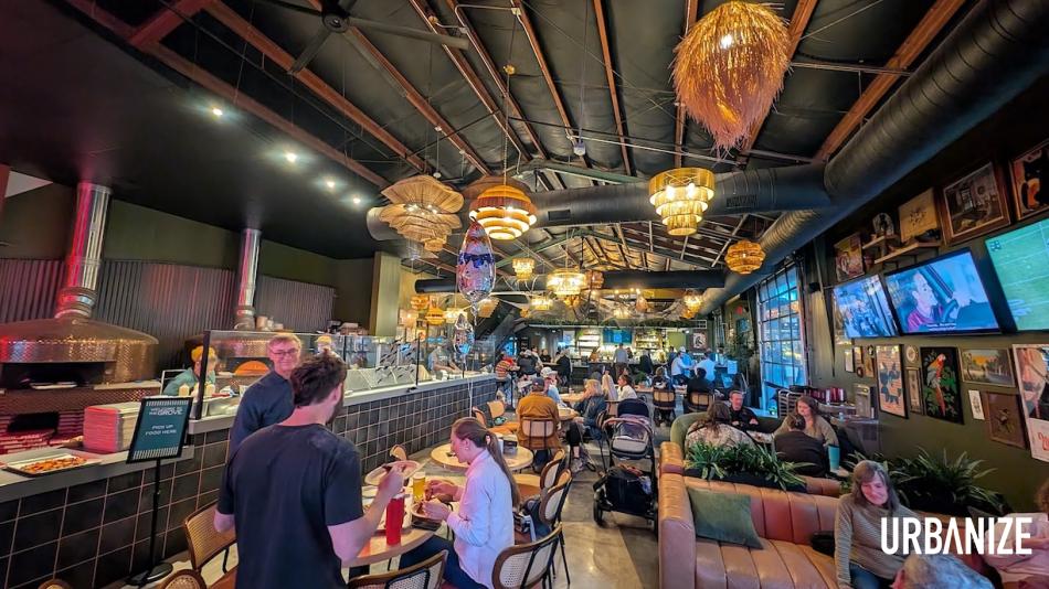 Features of The Grove include 17,000 square feet of outdoor communal space (beneath 62 preserved and newly planted native trees) with multiple fire pits; a 7,400-square-foot taproom with seasonal cocktails and 30 taps; an outdoor amphitheater for community gatherings and live music; two Italian-built ovens for house-made pizzas; and a 20-foot outdoor LED TV screen on a hillside.