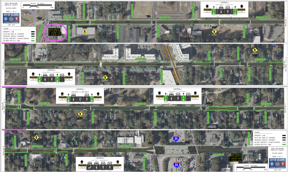 These four linear panels—starting at top left, from the south near Atlanta's federal prison—illustrate how the South Boulevard Complete Streets project will alter 2.4 miles of Boulevard soon. Courtesy of ATLDOT; alterations, Urbanize Atlanta