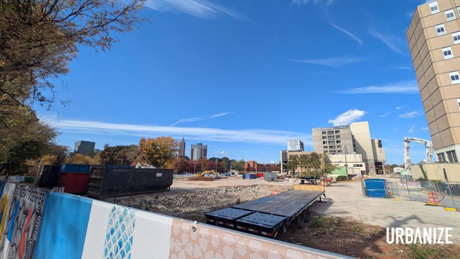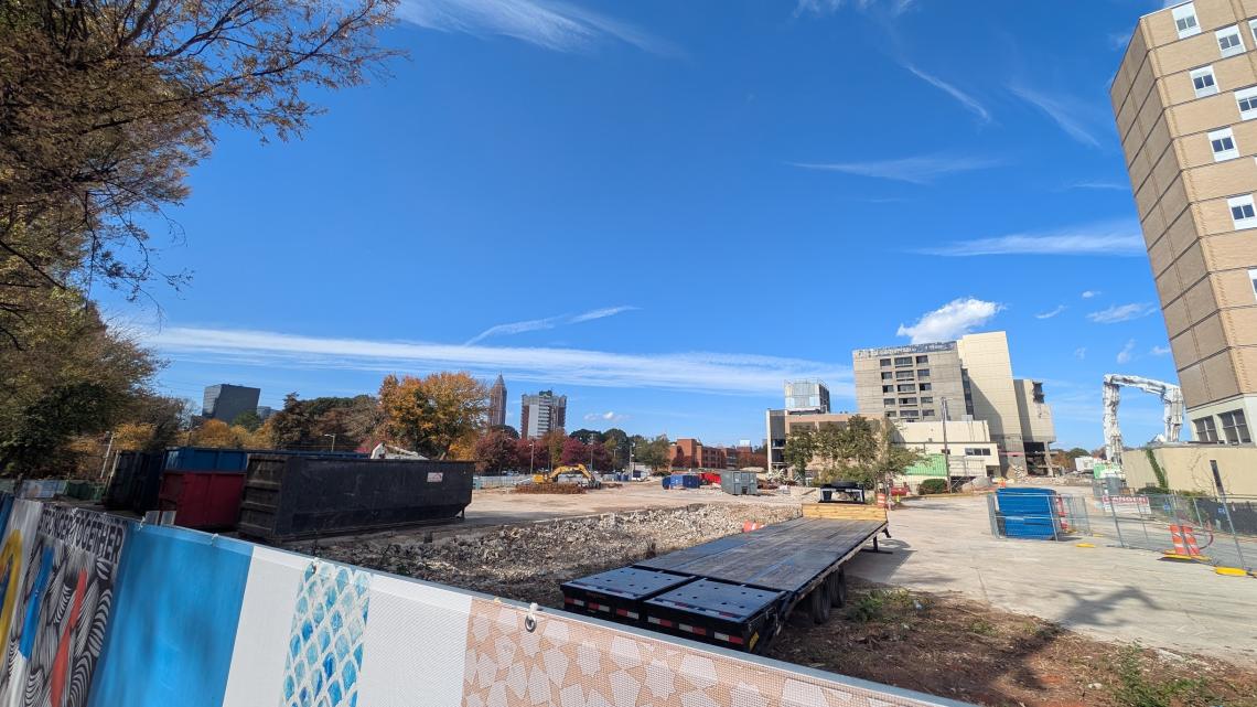Looking northwest to Midtown, a corner where ancillary Atlanta Medical Center buildings have been cleared along North Highland Avenue. Josh Green/Urbanize Atlanta