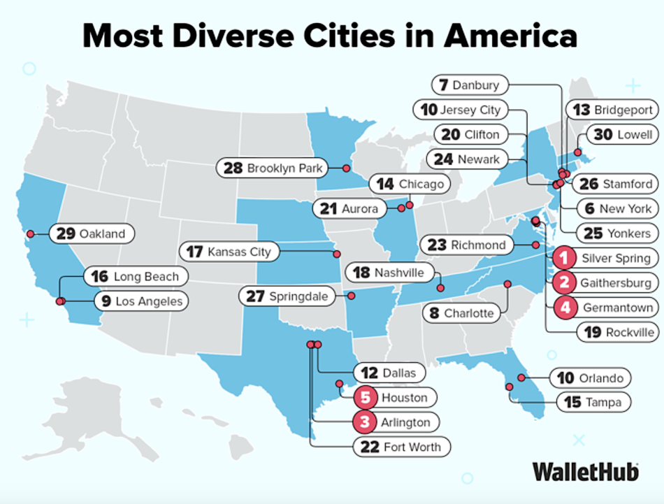 WalletHub compared profiles of the 501 largest U.S. cities across five major diversity categories to determine American places with the most (and least) mixed demographics today.