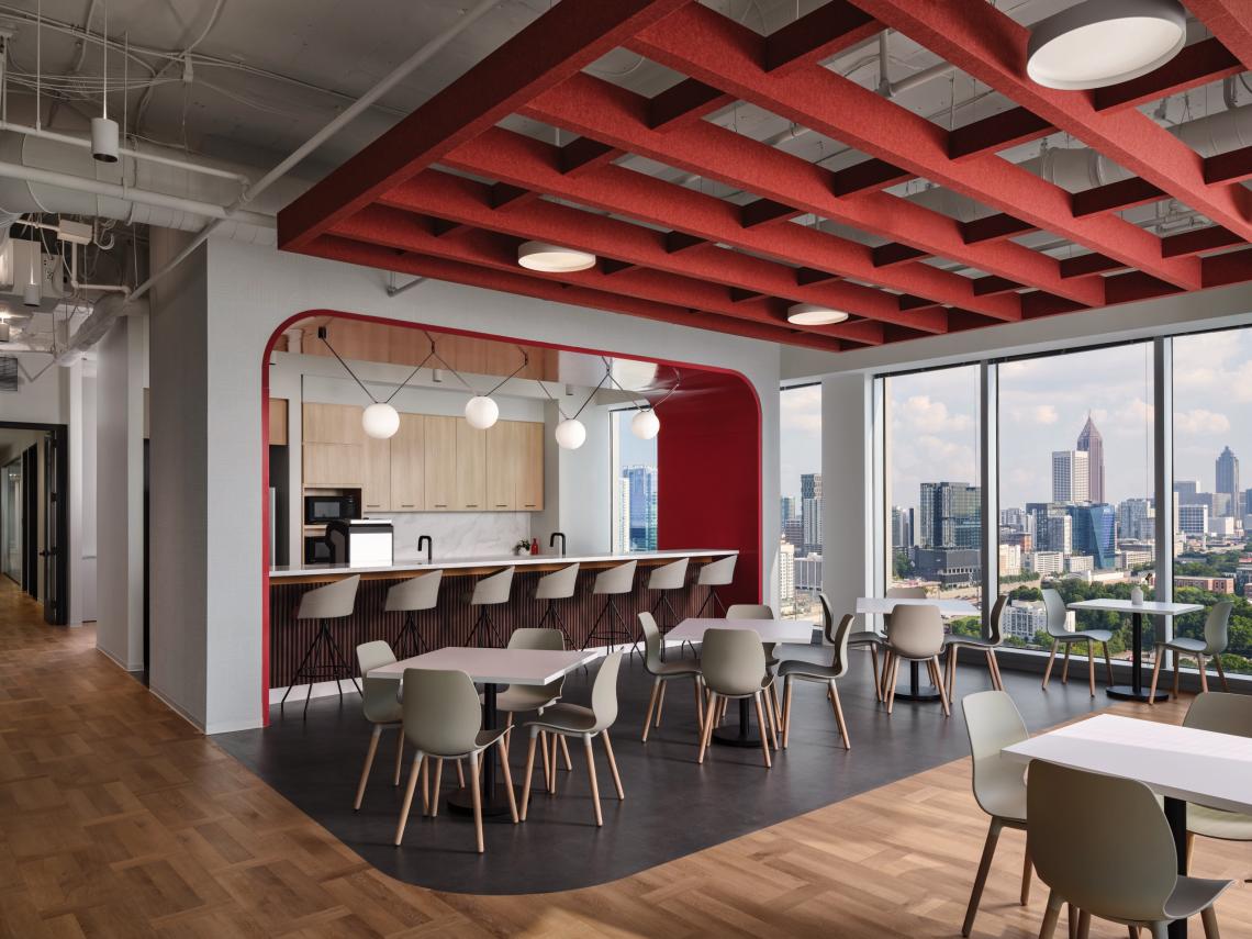 Design highlights include a refreshed and restored “grand staircase” left by a previous tenant. Each corner of the new offices features a “non-reservable huddle room” designed to frame sweeping city views. All break rooms also face the exterior, with a variety of seating arrangements, per the design firm.