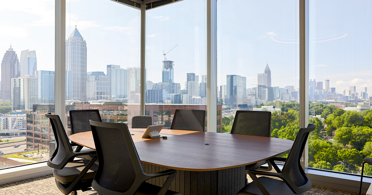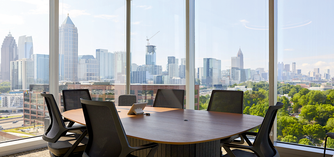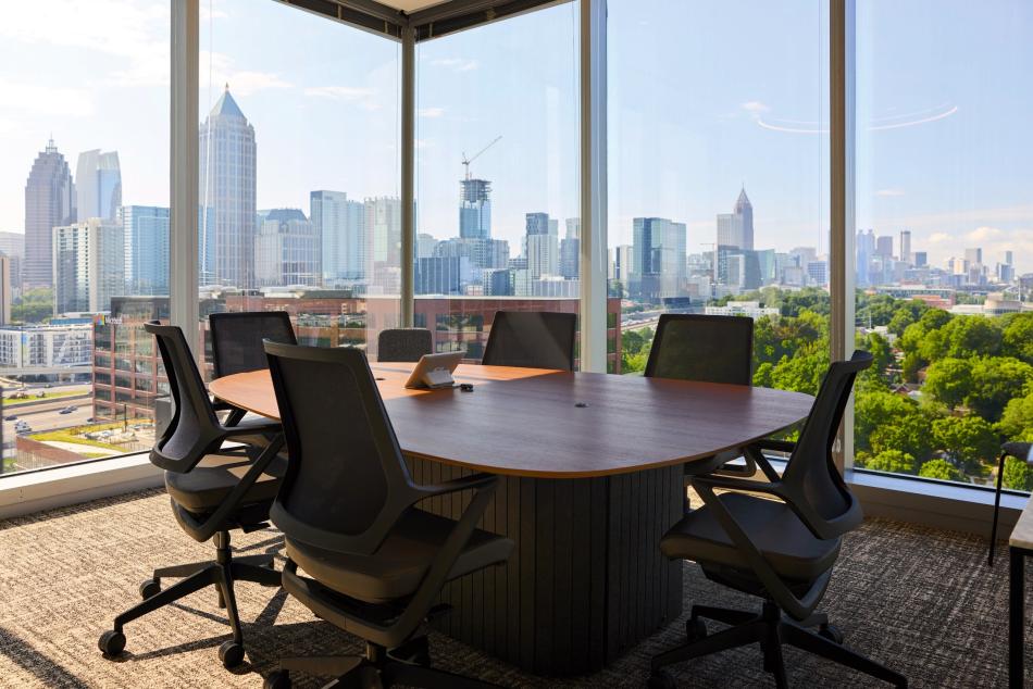 Example of a Piedmont huddle room at the corner of the building designed to maximize skyline views. Courtesy of Cooper Carry