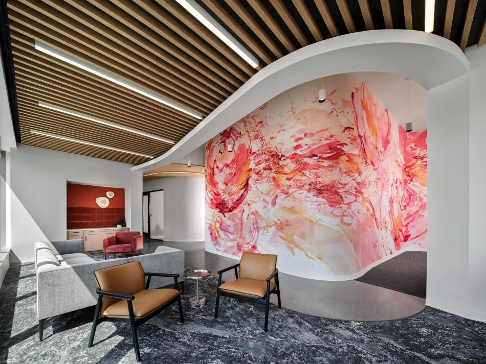 An original watercolor mural by Atlanta artist Christina Kwan on the building’s ground floor, as commissioned by Cooper Carry’s Experiential Graphics team. Courtesy of Cooper Carry