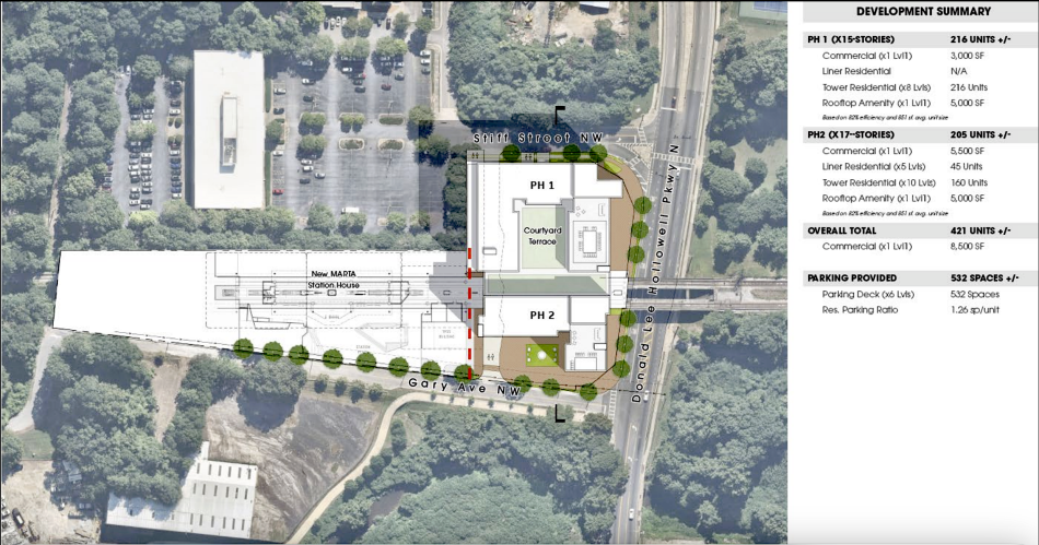 A development summary for the 1335 Donald Lee Hollowell Parkway transit hub calls for 421 apartments total across two phases, with more than 8,000 square feet for restaurants, shops, or other retail included.