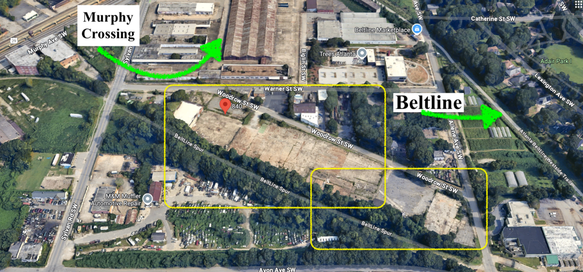 Rough overview of the acreage in question at 840 Woodrow St. (in yellow), with the Beltline's Westside Trail and Adair Park at right, and the Murphy Crossing property at top. Google Maps
