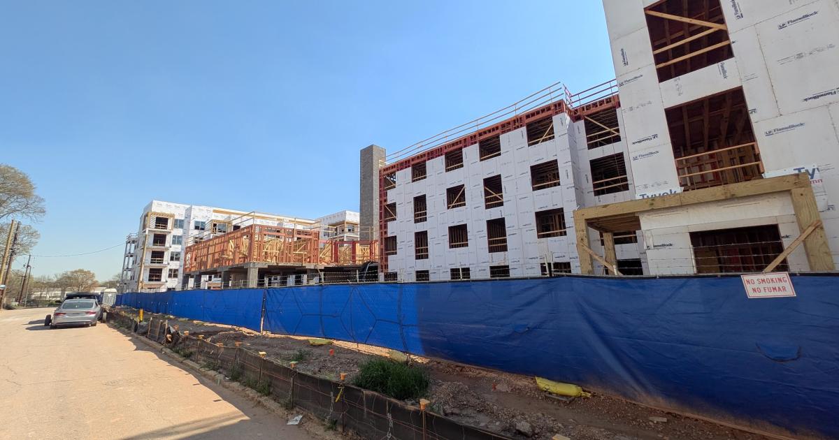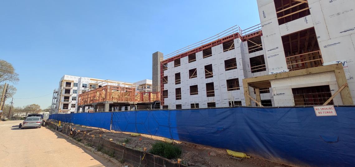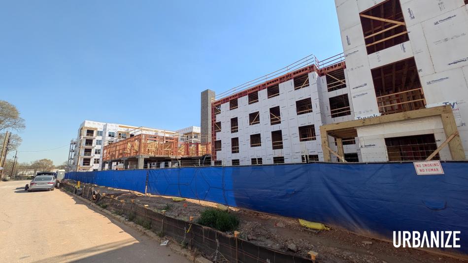 Where 840 Woodrow's topped-out, main residential pieces stood as of late March along Woodrow Street. Josh Green/Urbanize Atlanta