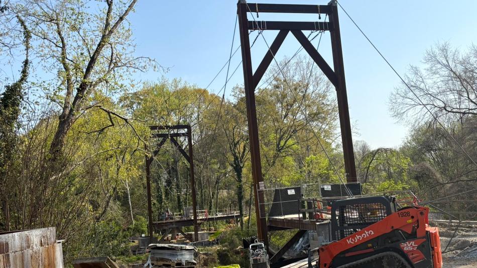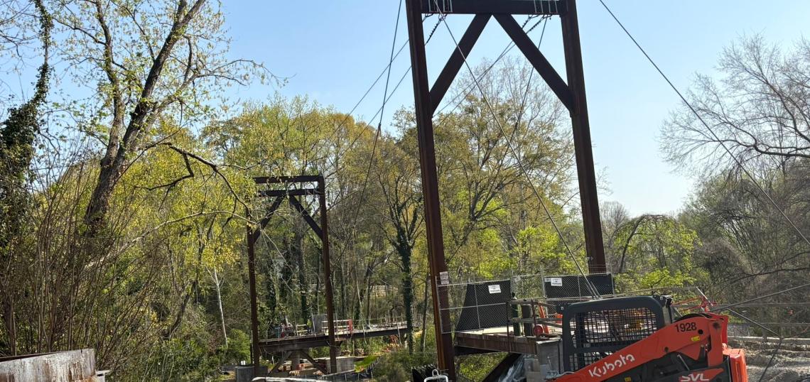 As part of Northwest Trail—Segment 1 construction in Buckhead, the suspension bridge high over Peachtree Creek was mostly completed in May, with a concrete multi-use trail atop it. “The suspension bridge is quite impressive in person,” wrote a commenter on these pages at the time. “It’s bigger than you'd think for a trail bridge.”