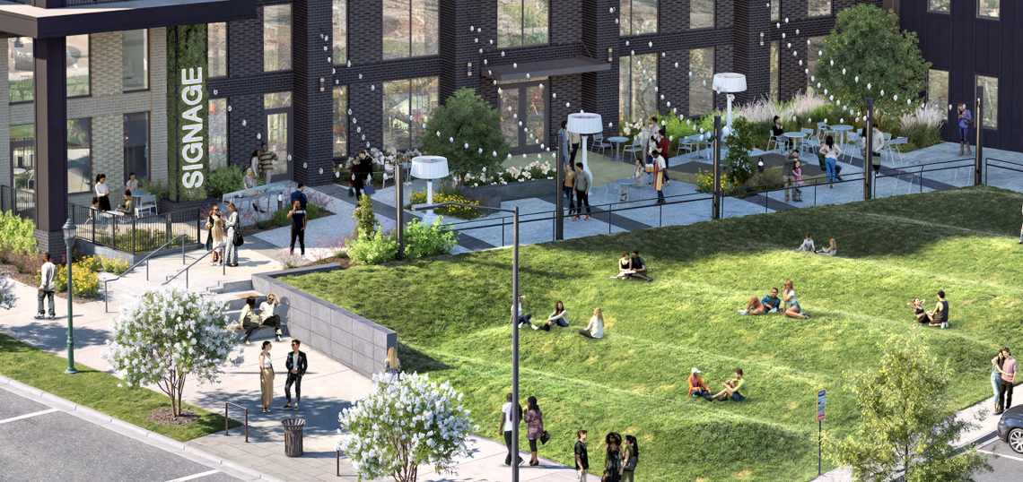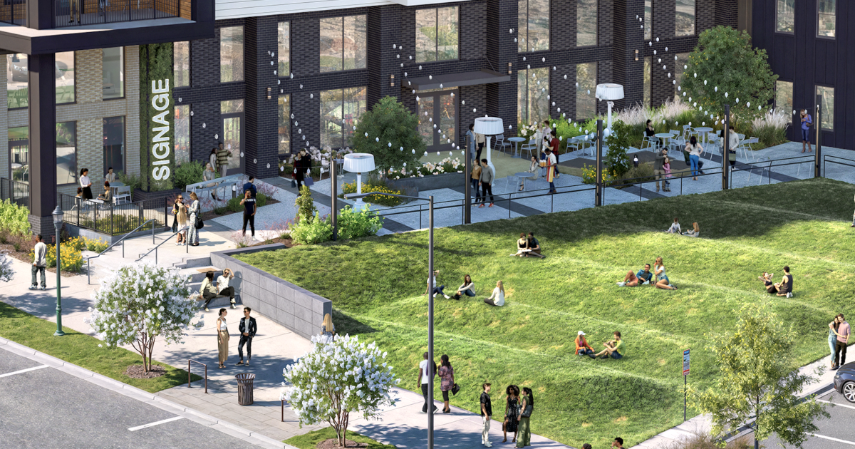 That standalone retail component is now being reserved as a future phase, however. In its place, for the time being, will be “an urban plaza [that] uniquely integrates dynamic hardscaping and a grassy knoll into one space,” according to project designers Niles Bolton Associates architects.