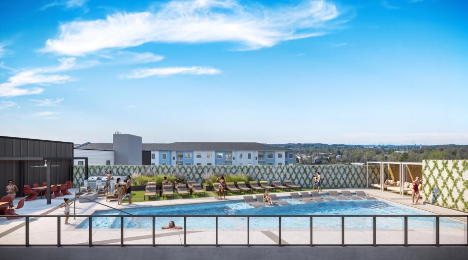 Rooftop pool, grills, and social zones bound for Novel Blandtown. Courtesy of Crescent Communities; designs by Niles Bolton Associates