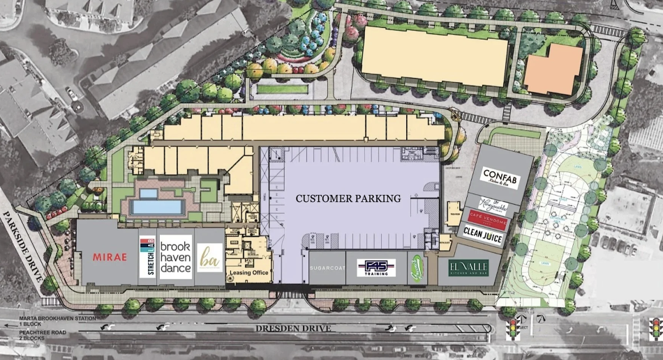 • MIRAE (5,000 square feet with patio at the corner of Dresden and Parkside drives)—from an operator with a successful restaurant in Chamblee, MIRAE (meaning “future” in Korean) is a new modern Asian concept that fuses Korean, Japanese, and other Asian flavors alongside a craft bar.
