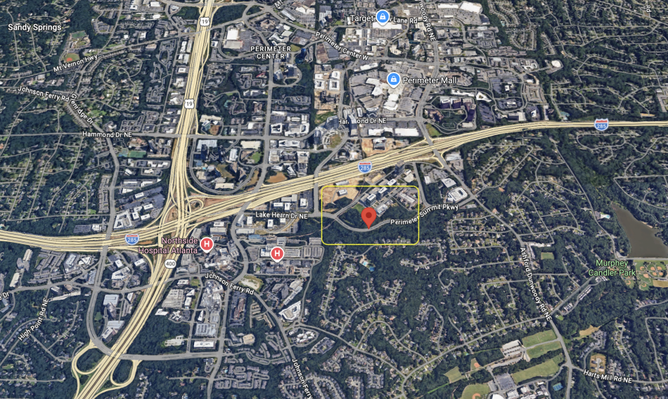 Overview of Perimeter Summit's location, prior to more recent construction, in relation to Perimeter Mall, Ga. Highway 400, and Interstate 285. Google Maps