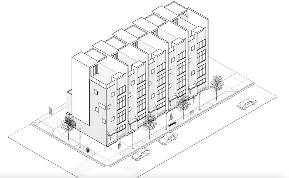 Per architects, the five townhomes each count three bedrooms and two and ½ bathrooms above garages, all spread across roughly 1,800 square feet and five levels. Rooftop decks with around 500 square feet of space are also included.