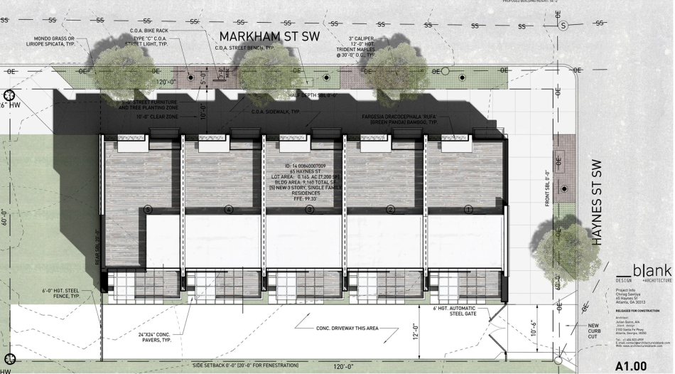 Five townhomes have taken shape on a .16-acre corner site where Markham and Haynes streets meet in Castleberry Hill. The Benz is roughly a block and ½ north of there.