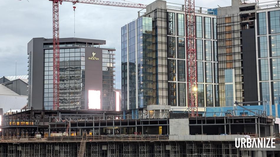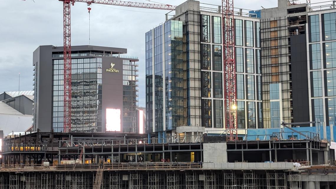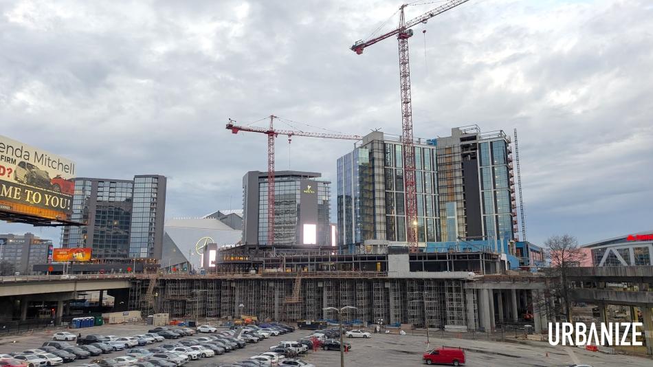 The topped-out boutique hotel project (right) in relation to the recently opened Hotel Phoenix (center) at Centennial Yards. Josh Green/Urbanize Atlanta