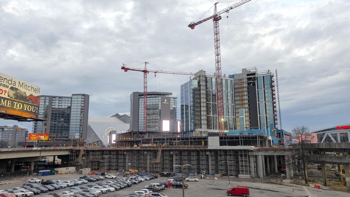 The recently topped-out hotel—a 14-story lodge previously described by Centennial Yards leadership as boutique—has risen at the edge of the Entertainment District farthest from Mercedes-Benz Stadium and State Farm Arena.
