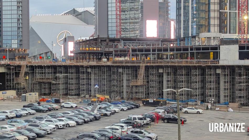 View from the southeast of massive support structures beneath the new Centennial Yards Entertainment District. Josh Green/Urbanize Atlanta
