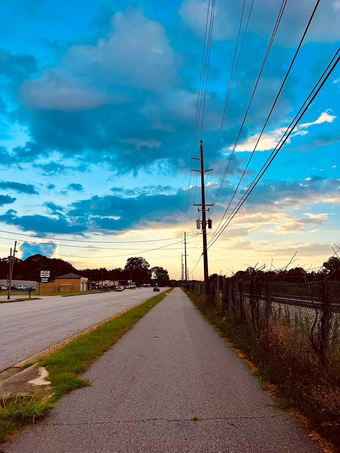 It’s a 5-and-1/2-mile straight shot along the Mountain to River Trail, or the M2R Trail, down West Atlanta Street until it becomes Atlanta Road. With few street crossings, the biking is continuous and pleasant. If you go at the right time, the sunset view from the trail is spectacular, with wide open space over your shoulder at Dobbins Air Reserve Base.