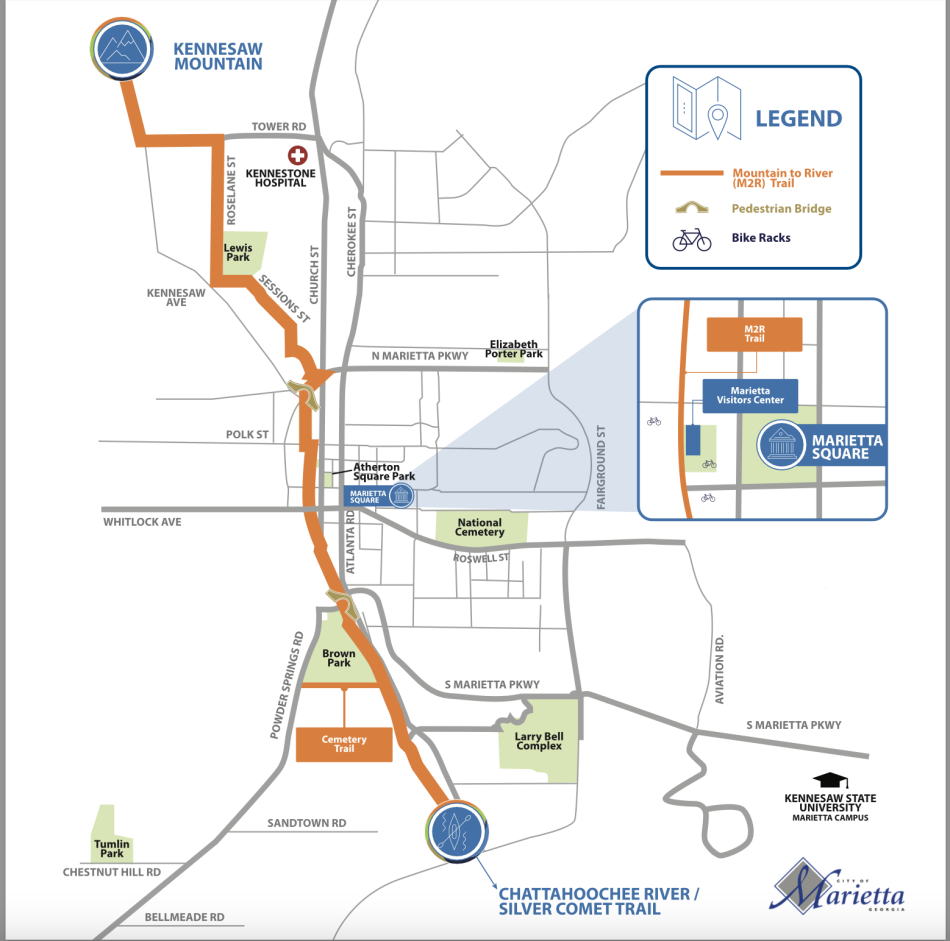 Overview of the full M2R Trail, a multi-use link between numerous Cobb County landmarks. City of Marietta