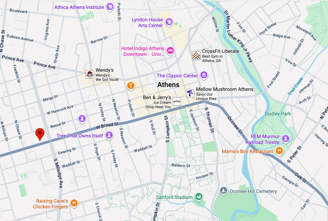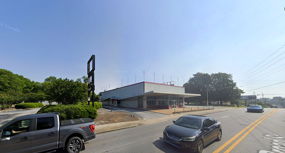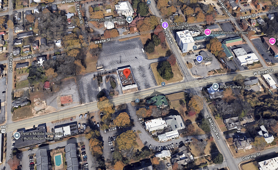 The long-vacated former Varsity property on West Broad Street in 2023, with the bulk of downtown Athens at right. Google Maps