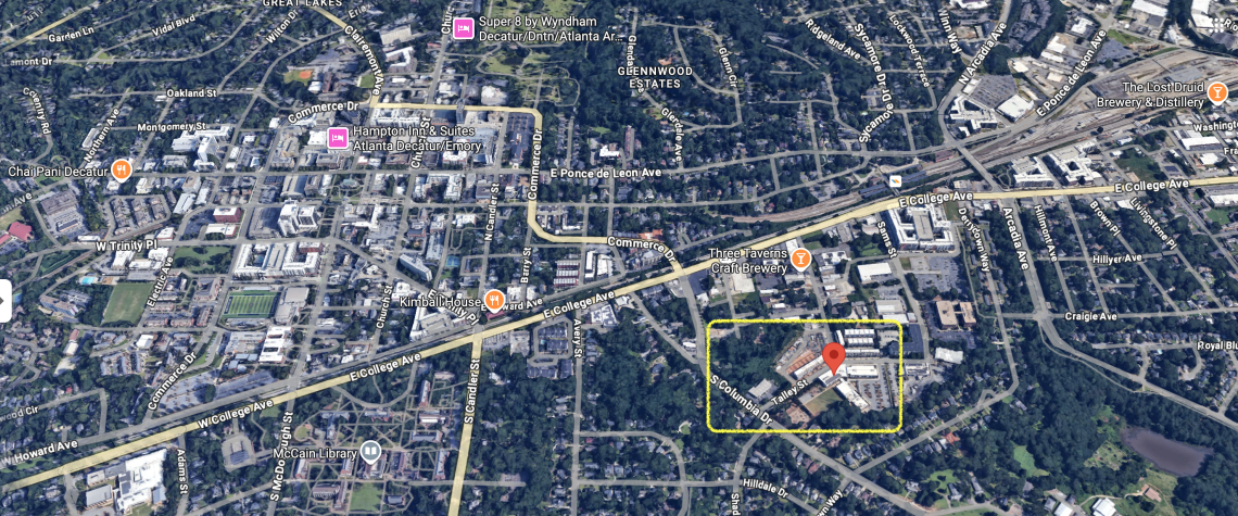 The New Talley Station site (bottom right) in relation to downtown Decatur, Avondale Estates, and other eastside landmarks. Google Maps