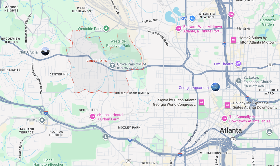 Grove Park's boundaries in relation to Midtown, downtown, and Shirley Clarke Franklin Park (formerly Westside Park). Google Maps