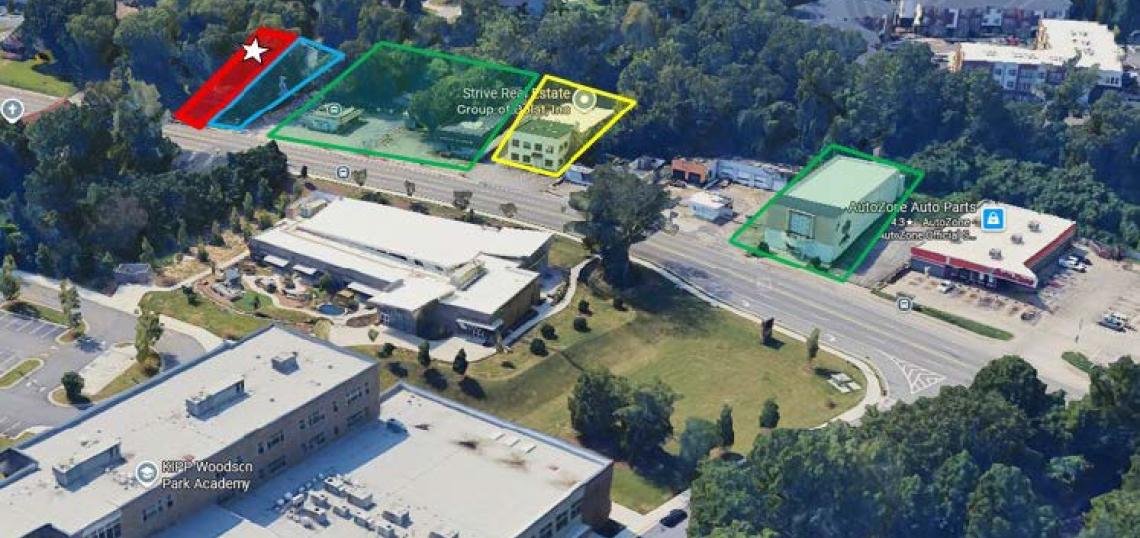 Row of several Grove Park properties in question (the historic former theater is at right), looking south from above KIPP Woodson Park Academy. Invest Atlanta