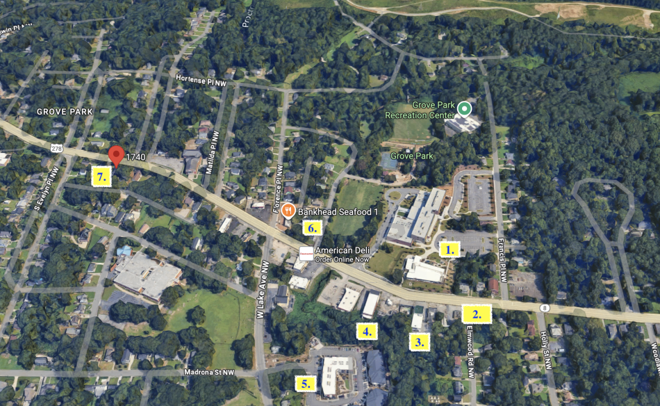 Broad overview of Grove Park's commercial district, with Atlanta's largest greenspace, Shirley Clarke Franklin Park, shown at top. Google Maps/UA