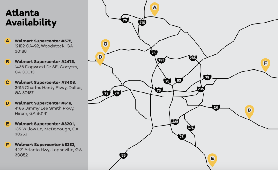 Initially, deliveries will be made from six Walmarts in relatively far-flung OTP locales encircling Atlanta, from Woodstock to Conyers and around to Hiram in the far western suburbs.