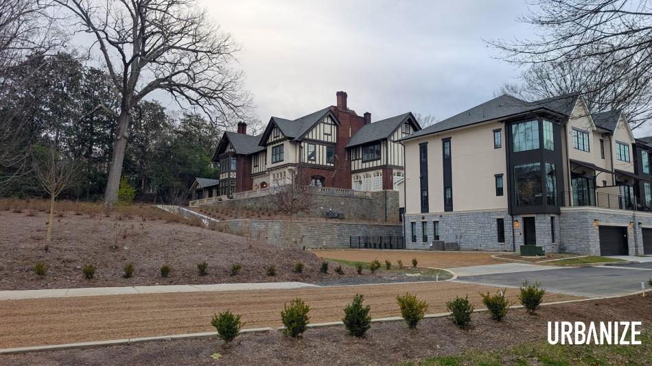 At the southern rim of Downing Park, the two standalone manor houses are shown at left earlier this month. Josh Green/Urbanize Atlanta