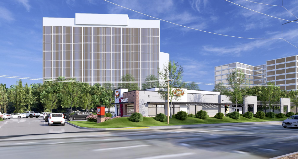 Proximity of the Le Meridien Atlanta Perimeter hotel (background) in relation to the Raising Cane's proposal. Courtesy of City of Dunwoody/Raising Cane’s application/PM Design