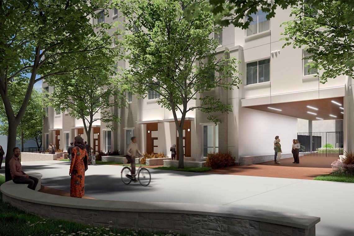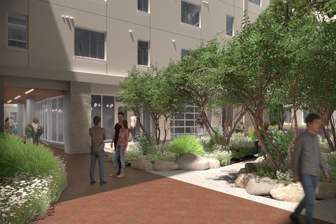 The Ridge's south courtyard entryways. Renderings by Ayers Saint Gross, courtesy of Emory University