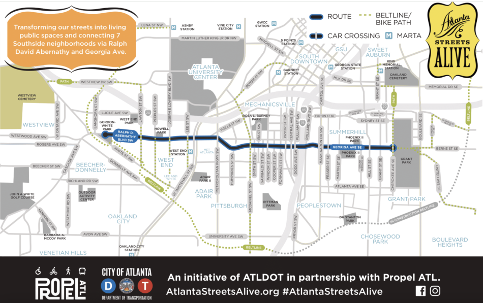 The 3.4-mile route opens Ralph David Abernathy Boulevard and Georgia Avenue from West End to Grant Park, with Mechanicsville and Summerhill’s commercial district in between. The free, family-friendly events are open to anyone on foot, bikes, scooters, skateboards, or any other mode of transportation except cars. Dogs on leashes are also welcome.