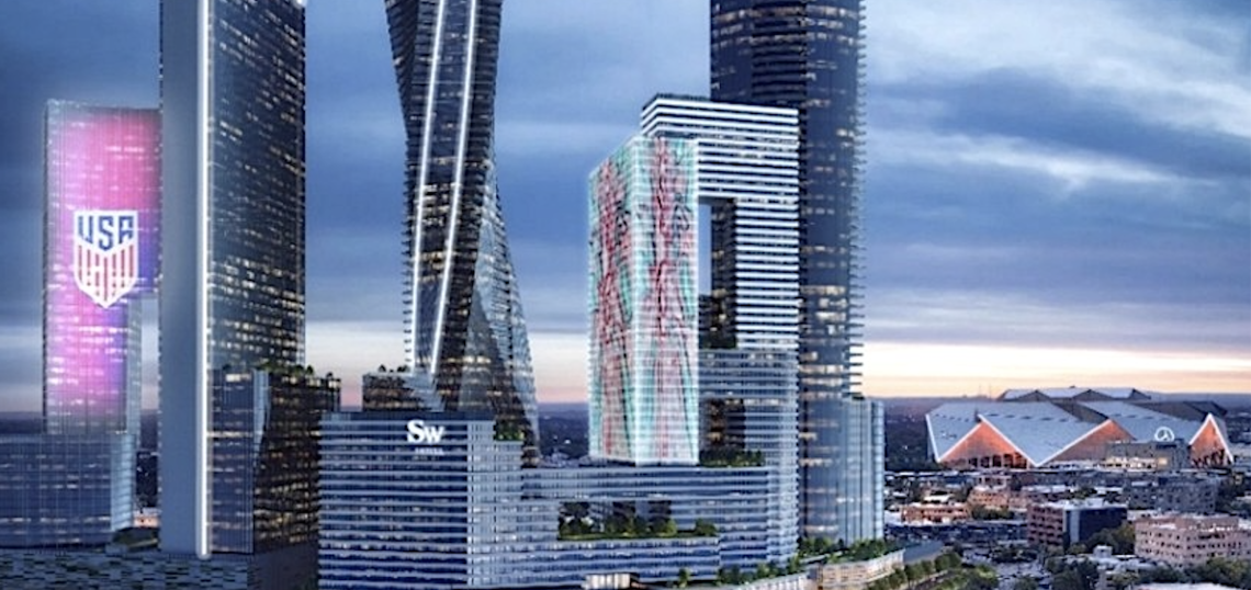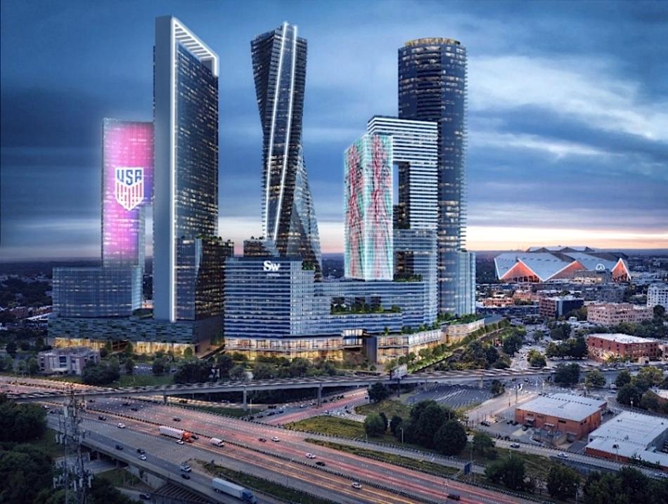 Daytime rendering of the high-rise Forge Atlanta proposal between Interstate 20 (bottom) and Mercedes-Benz Stadium. Renderings courtesy of Forge Asset Management