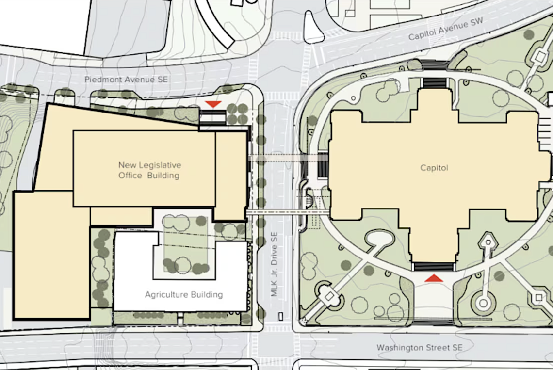 Just north of the Georgia State Capitol, across Martin Luther King Jr. Drive, the eight-story legislative office building is replacing two partially vacant, state-owned structures at a prominent downtown corner. Demolition of the former buildings started in late summer 2024.