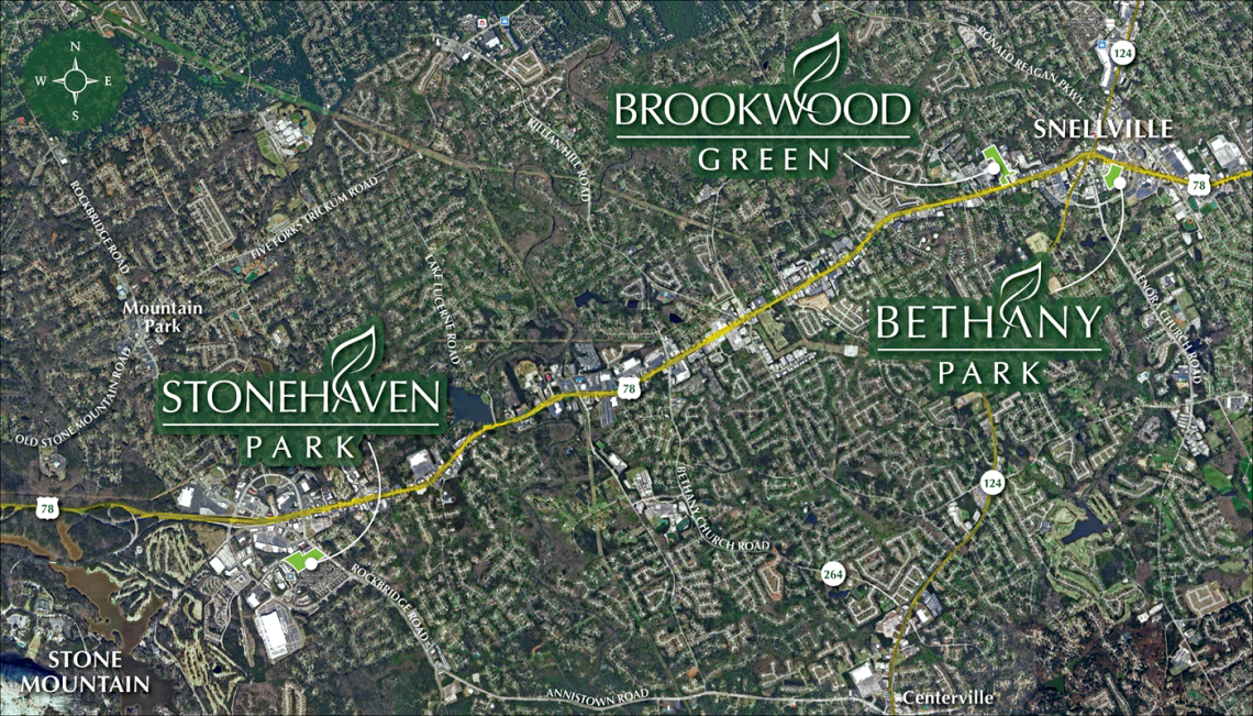 Overview of Parkland's three recent land purchases in Snellville for new townhome ventures. Parkland Communities
