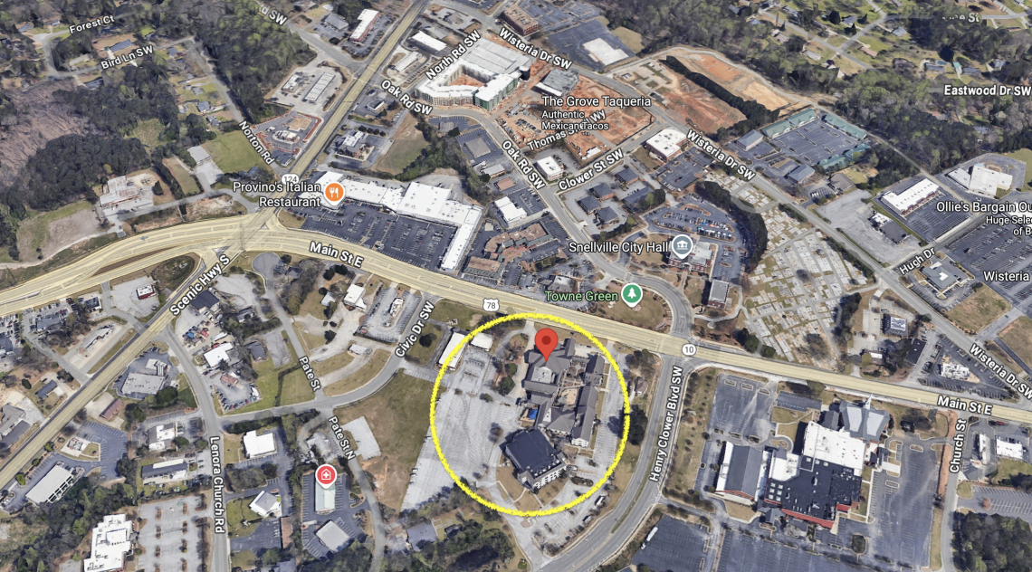 Snellville Community Church's property in relation to Main Street and the city's nine-building The Grove at Towne Center project, as shown when under construction. Google Maps